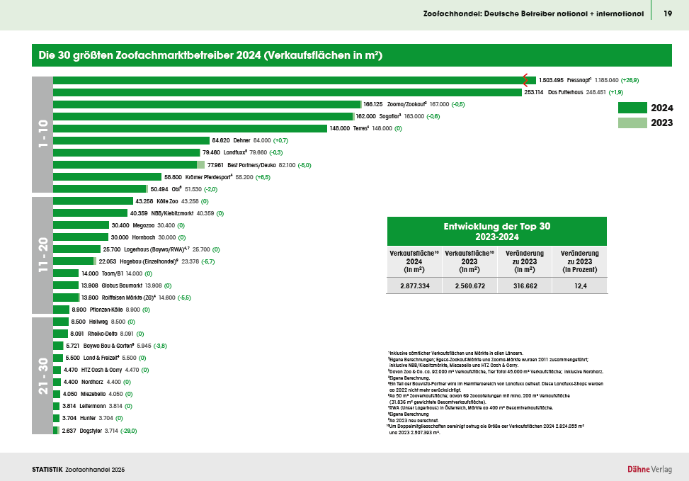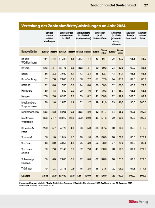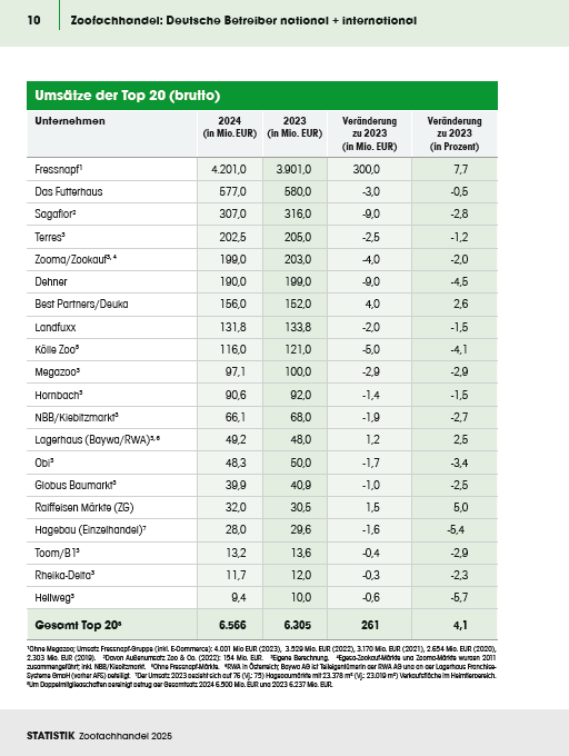 Statistik Zoofachhandel provides current figures, statistics and analyses on the pet retail sector in Germany, Austria and Switzerland as at 31 December 2024. The solid database and analysis source for decision-makers in the industry as well as for management consultancies, market research companies and associations. Also available as a subscription with a 10% discount on the respective individual price**
